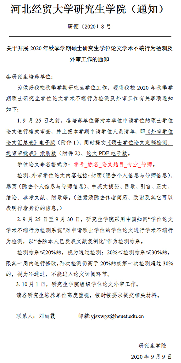 关于开展2020年秋季学期硕士研究生学位论文学术不端行为检测及外审工作的通知