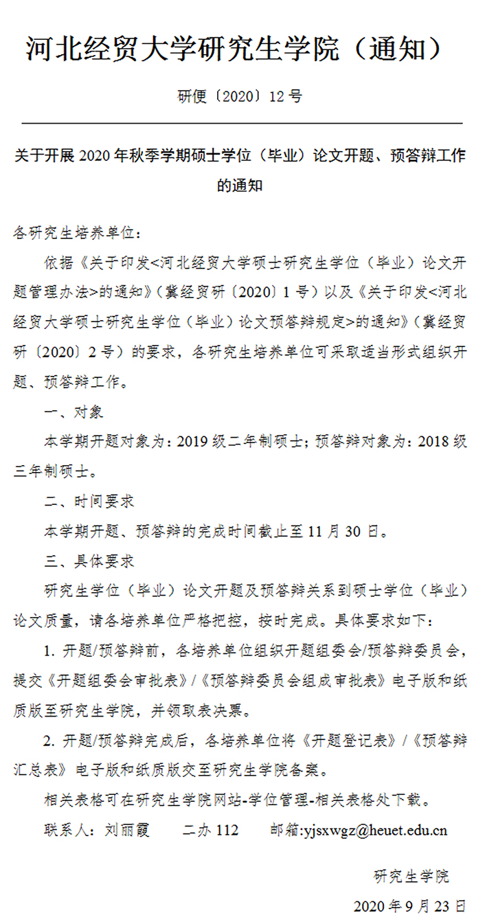 关于开展2020年秋季学期硕士学位(毕业)论文开题、预答辩工作的通知