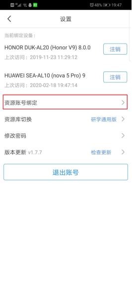 2)手机端:在登录“知网研学”后,点击个人头像,进入个人中心-绑定资源下载账号,手动填写机构资源下载账号和密码,具体见下表。